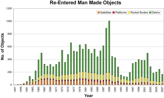 Questo grafico, anche se piuttosto vecchio (2007), mostra l'andamento del numero di oggetti fabbricati dall'uomo rientrati ogni anno sulla Terra: