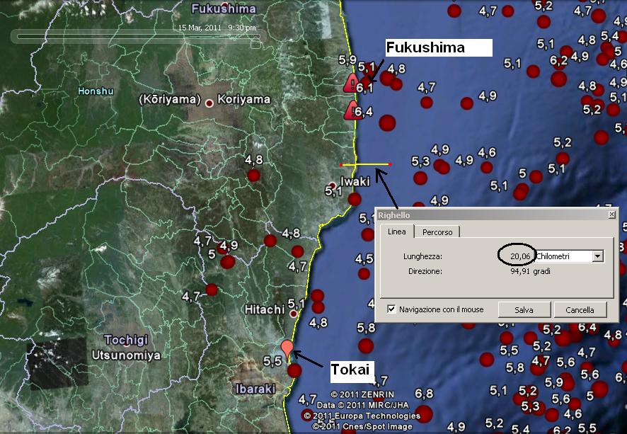 Un dettaglio su un fotogramma dell’ultimo filmato mostra la vicinanza di alcune scosse con alcune delle 55 centrali nucleari presenti in Giappone: